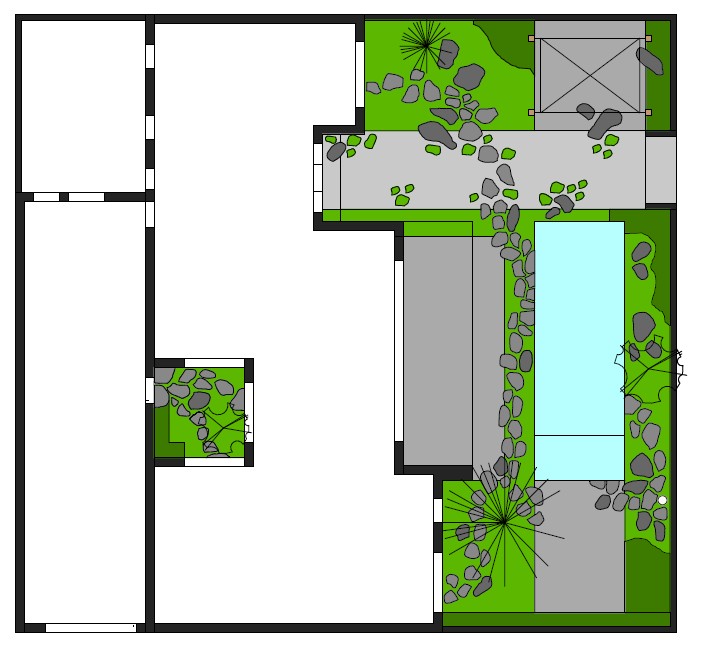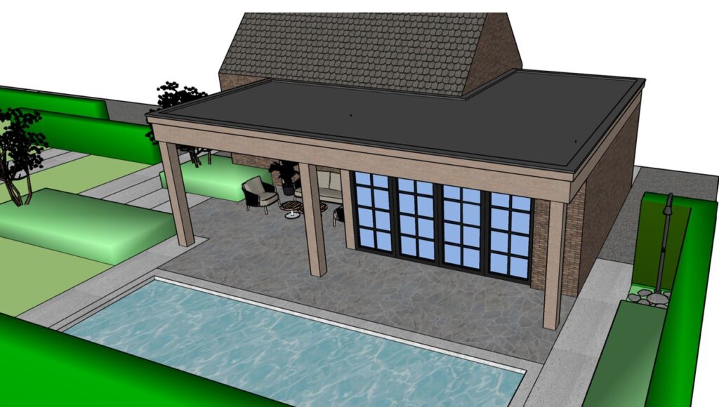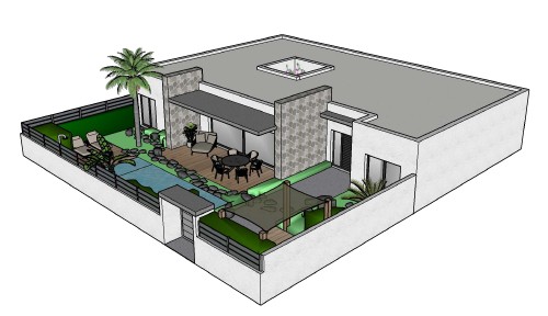 Deze compacte, ommuurde tuin met zwembad is ontworpen om een aangename leefruimte te creëren in het mediterrane klimaat. Het ontwerp combineert water, schaduw en rijke beplanting om het hitte-eiland effect te beperken en verkoeling te bieden tijdens de warme maanden. De tuin bevat een zwembad met buitendouche, een zonneterras voor ligbedden, een overdekt terras dat aansluit op de woning en een apart schaduwterras. Achteraan sluit een patio in dezelfde stijl naadloos aan. De beplanting bestaat uit grote bladplanten en een volledig bedekte bodem, met laagblijvende bodembedekkers tussen de stapstenen. Grote zwerfkeien zorgen voor robuuste accenten, terwijl een koningspalm en een begroeide tuinmuur hoogte en structuur toevoegen. Het resultaat is een compacte maar veelzijdige tuin die rust, verkoeling en een tropische sfeer uitstraalt, perfect afgestemd op het mediterrane klimaat.