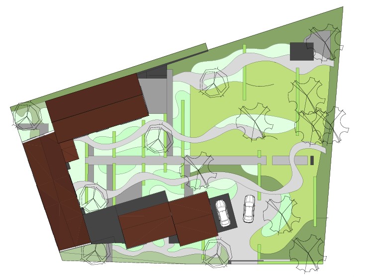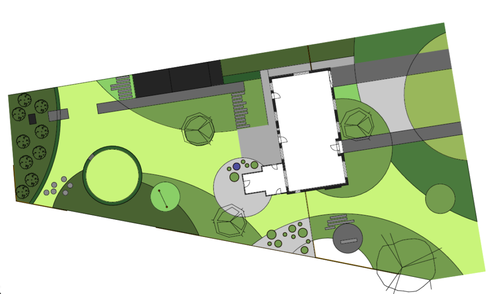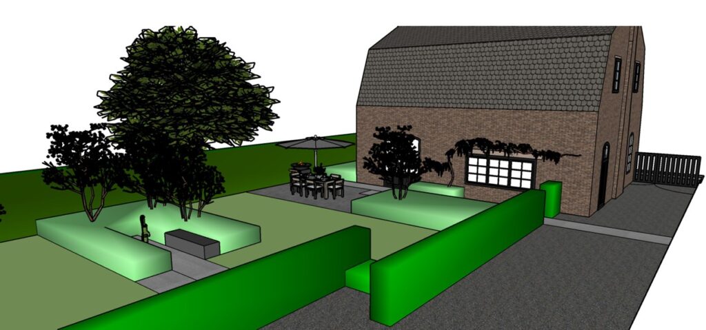 Voor deze tuin stond de liefde van de eigenares voor Feng Shui centraal. Het ontwerp vertrekt vanuit de ronde meditatiezone die reeds aanwezig was en vormt zo het hart van de buitenruimte. Vanuit dit middelpunt zijn cirkels in verschillende groottes doorheen de tuin verweven. Ze zorgen voor een vloeiende, organische dynamiek die telkens wordt doorbroken door strakke, rechte lijnen. Dit contrast geeft de tuin een spannend ritme en een gevoel van balans. Het eindresultaat is een tuin die rust en energie combineert. De cirkelvormen en rechte lijnen creëren samen een evenwichtige compositie, terwijl de beplanting en materialen zorgen voor een warme, uitnodigende sfeer. Het is een plek waar functionaliteit en esthetiek elkaar ontmoeten, en waar de eigenares zich volledig kan verbinden met haar passie voor Feng Shui.